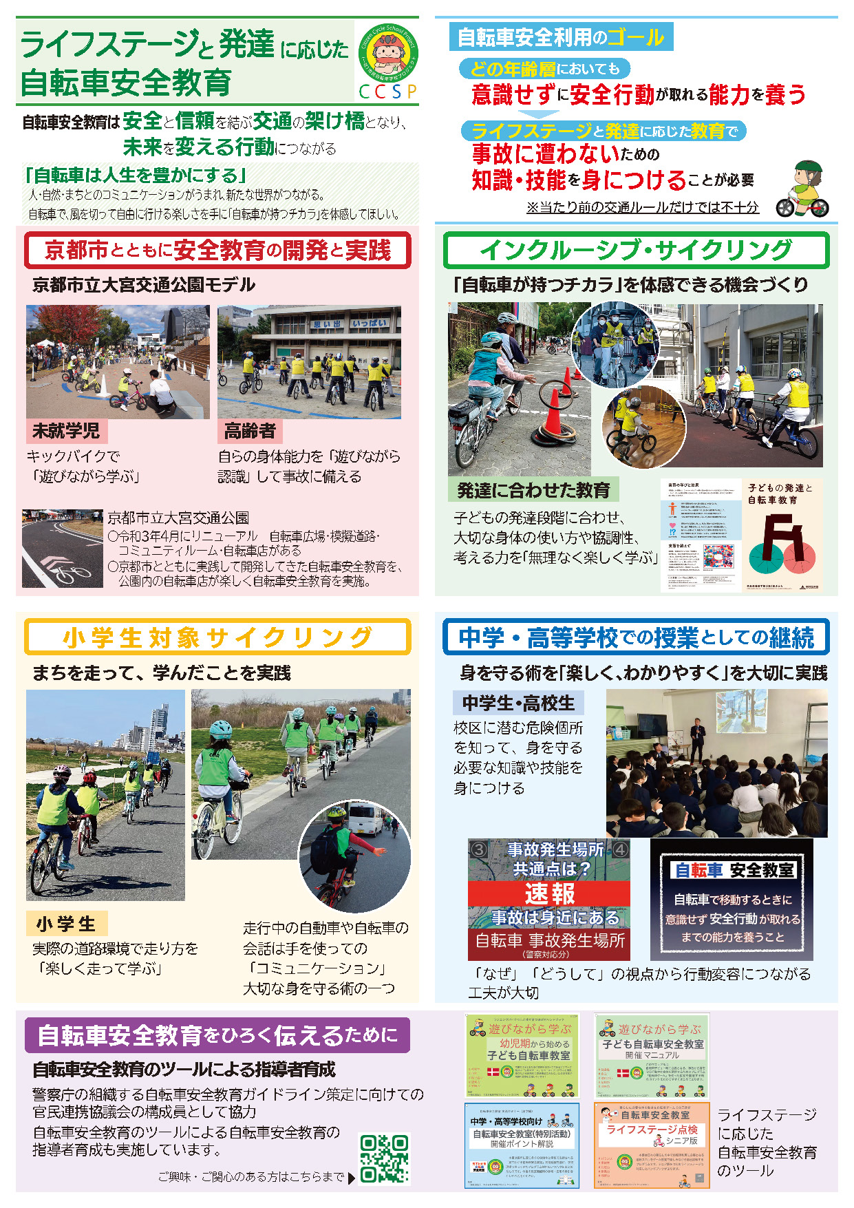 CCSPは、これからも自転車を多世代で安心して利用していただくための「ライフステージと発達に合わせた自転車安全教育の開発と提供」を続けて行きます。